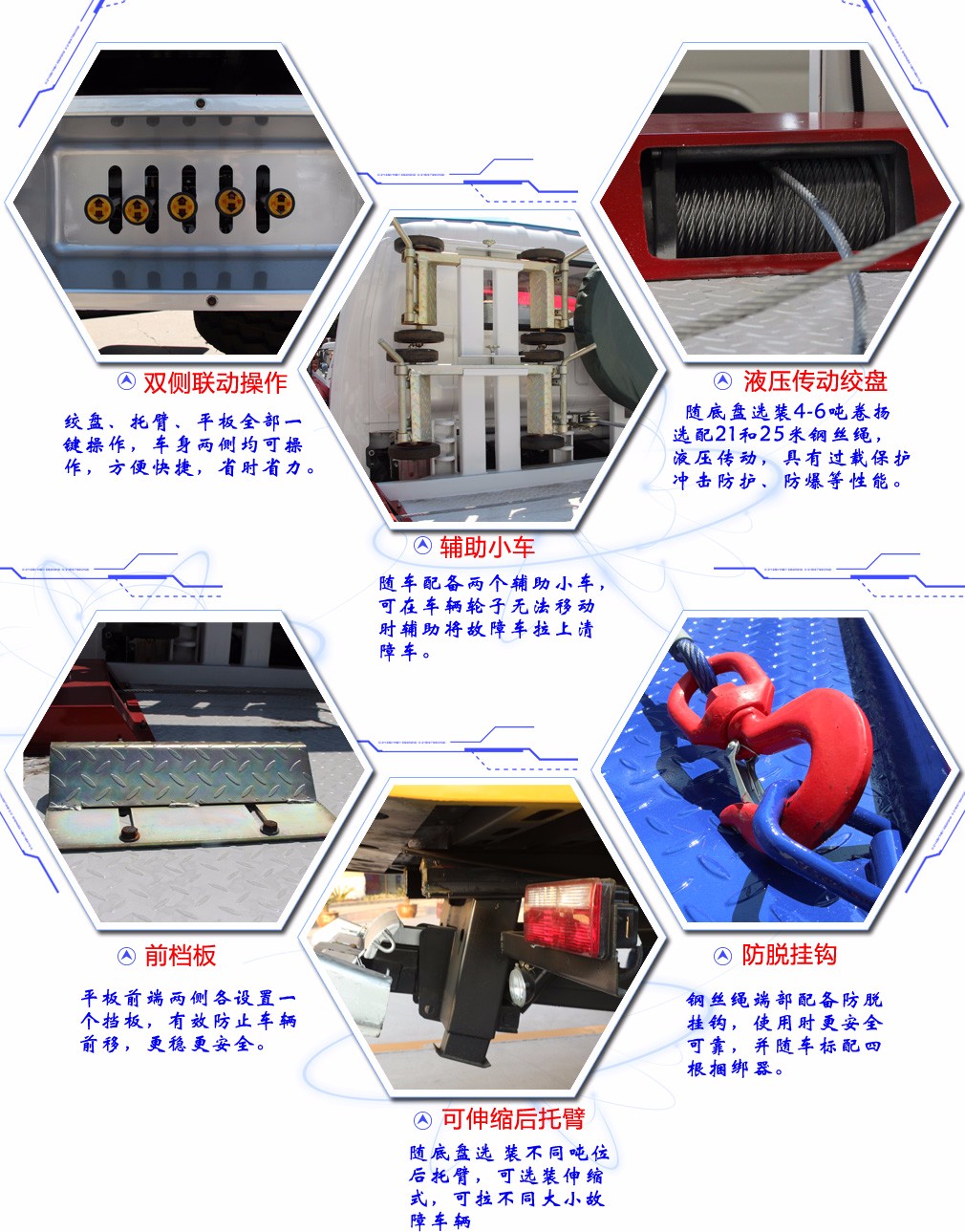 | 改裝工藝: | 6噸上裝,6噸卷揚,5噸后拖臂,25米鋼絲繩,板長6.2米,寬2.4米。雙側聯動操作,全液壓翻轉板,新款上裝(不要后托臂減三千)**燈喊話器一套,**小車一套,四根捆綁帶 |